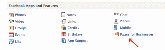 Once you have your personal Facebook page set up and operational, it’s time to think about doing the same with your business Facebook account. To get the directions you need to get started, choose the ‘Account’ pulldown menu located in the upper right corner of your Facebook page. Toward the bottom you will see ‘Help Center.’ Choose that. This will bring you to a page of help topics. As of this writing in March of 2011, in the middle section under ‘Facebook Apps and Features’ you should see ‘Pages for Businesses,’ as shown in the graphic below.